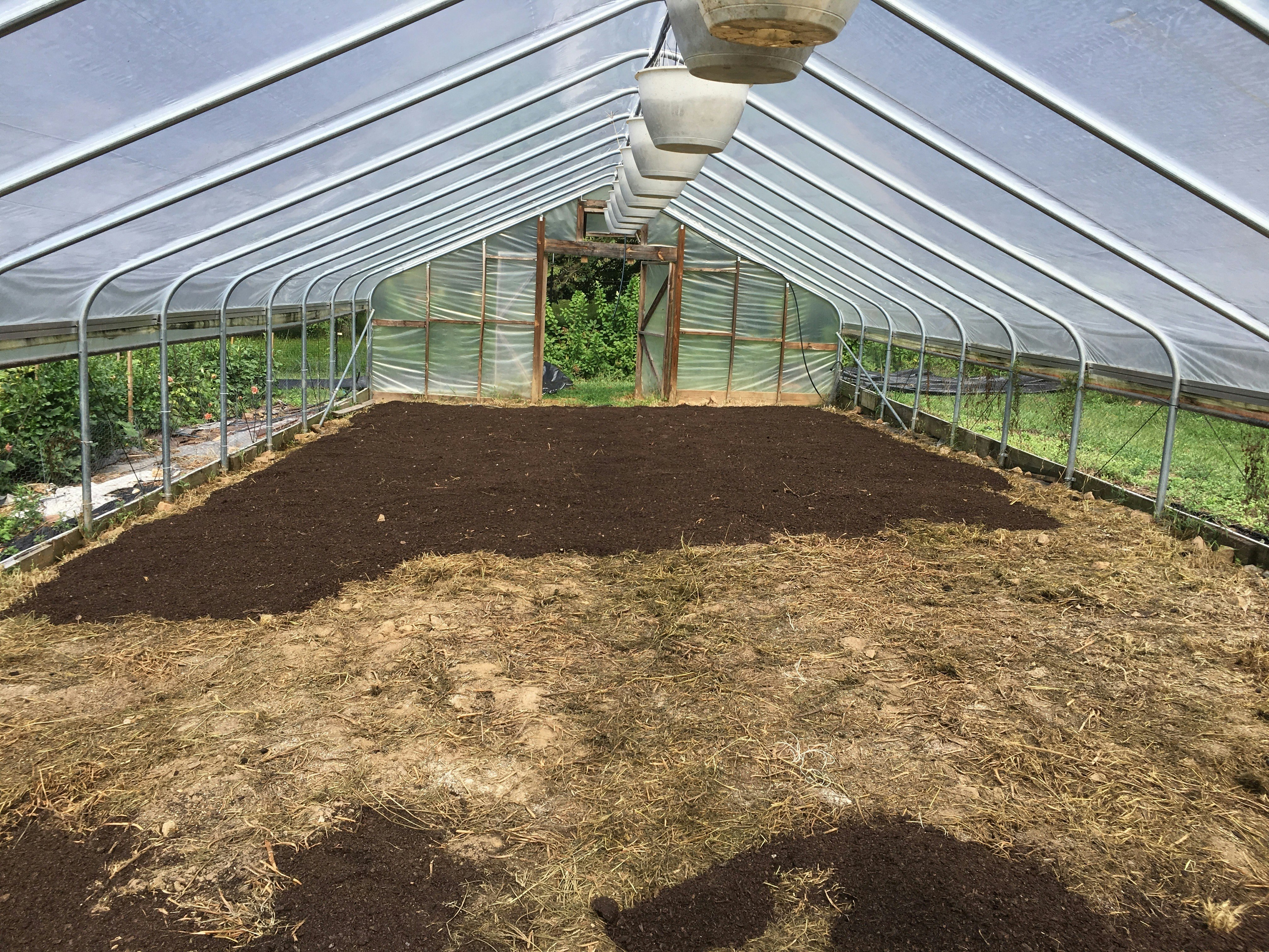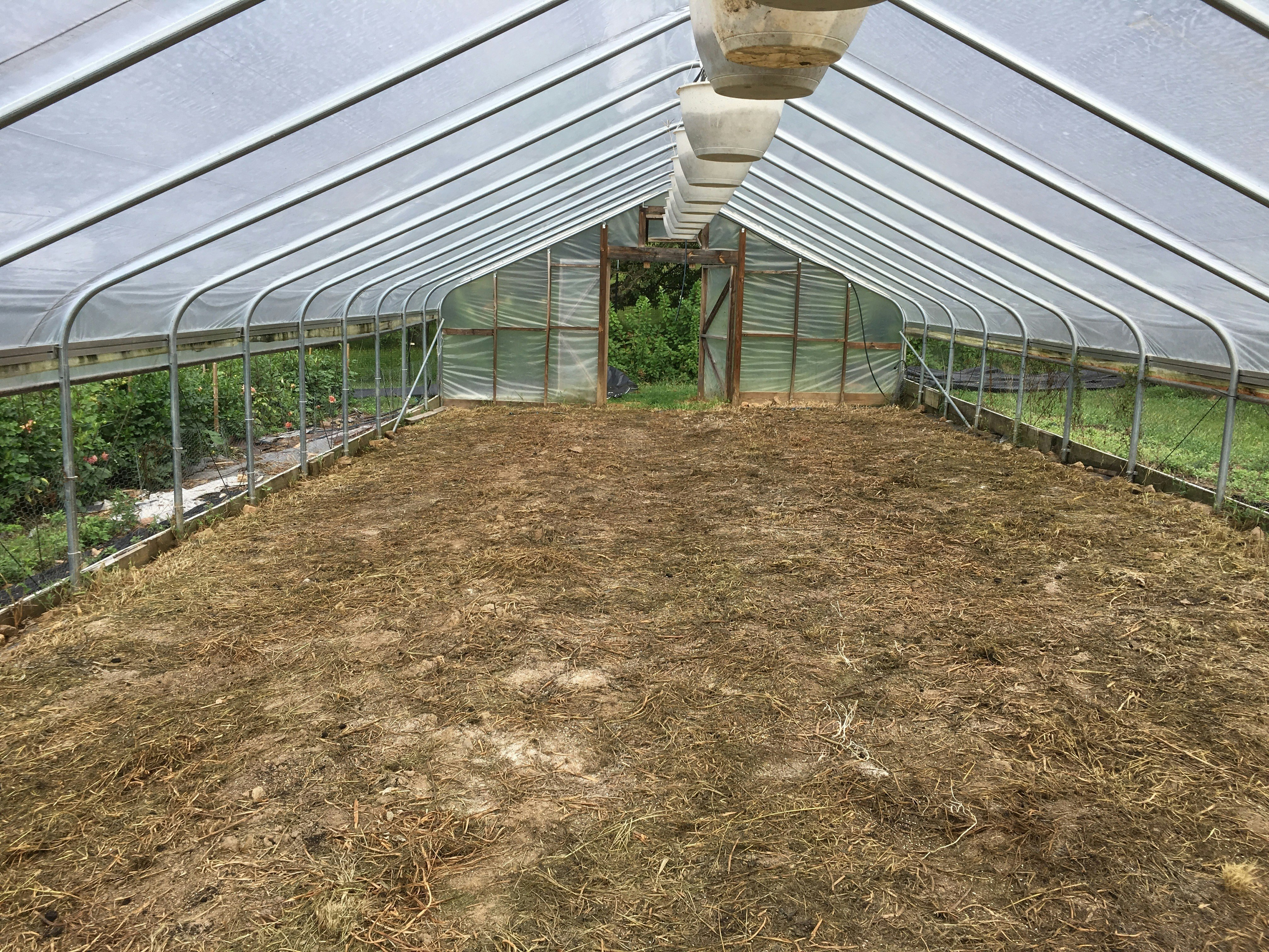 After removing the cash crops in late May, all irrigation and other crop infrastructure was removed from the hoop house beds to create a blank slate. Any large weeds were pulled and removed from the house. The soil was broad-forked.