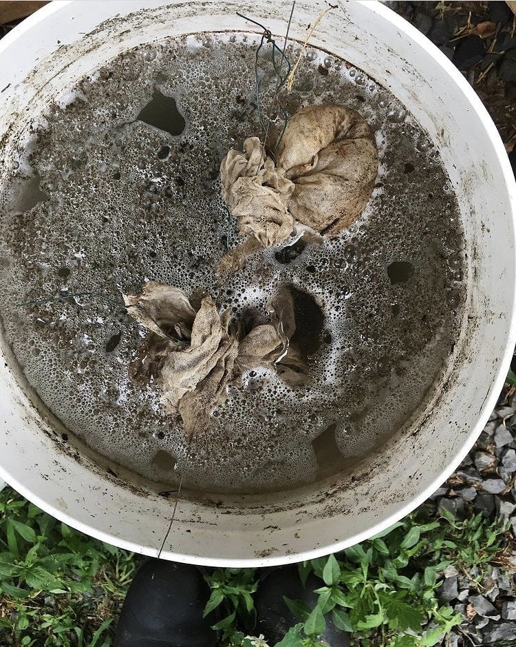 Once the mesh bags are in the water, take the bag that contains the potato in your hands (holding it below the water still) and smash it up so that the water turns cloudy with the potato starch. This is food for the microbes so they can multiple! Next, massage the bag with the leaf mold a bit until the water turns brown, ensuring water is penetrating well into the leaf mold.