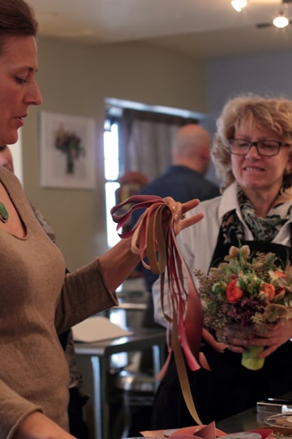 And then the moment I’d been waiting for all day. She demonstrated how she gets all that amazing ribbon so neatly attached to the stems. It’s so simple once you see it, but I honestly am not sure how to describe it. It took real restraint not to bear hug the woman in appreciation as she put the final pins in place.