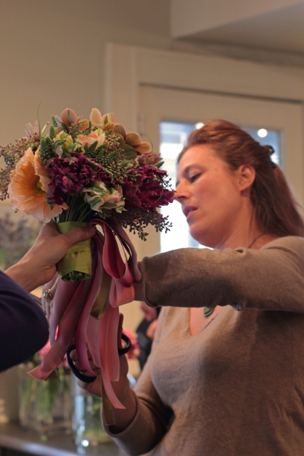 Armed with a fantastic set of new techniques, we were let loose to create our own bridal bouquets with Ariella walking the room to offer feedback and pointers. My first instinct was to do a spiral hand-tied like I always do. It’s so familiar and easy. But then I caught myself and made a point to try Ariella’s layering technique instead. It felt pretty awkward for several minutes, but then I found a happy marriage between her technique and my familiar spiral that really worked in an amazing new way. The design came together quickly and cheerfully after that. Adding the ribbon was pure perfection. My bridal bouquets will never be the same!
