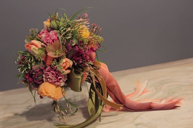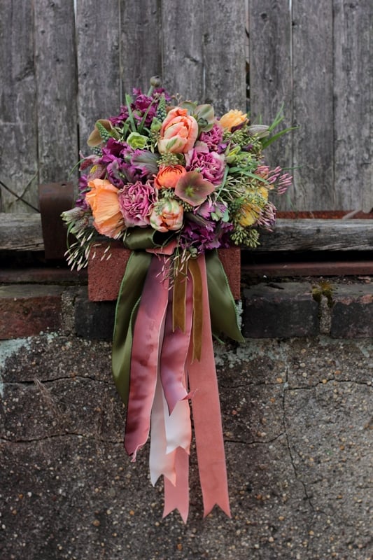 A long time inspiration of mine has been Ariella Chezar. She revolutionized the art of modern floral design when she brought a loose, wild, organic (and seasonal) aesthetic to the East coast, particularly New York City, about ten years ago. I’ve always felt a distant kinship with her; she grew up in the country and found her way to the “big city” and floral design through a sheer love of the flowers, she loves working with locally-grown materials, and she loves color and texture. Oh, and she uses a ton of luscious ribbon.